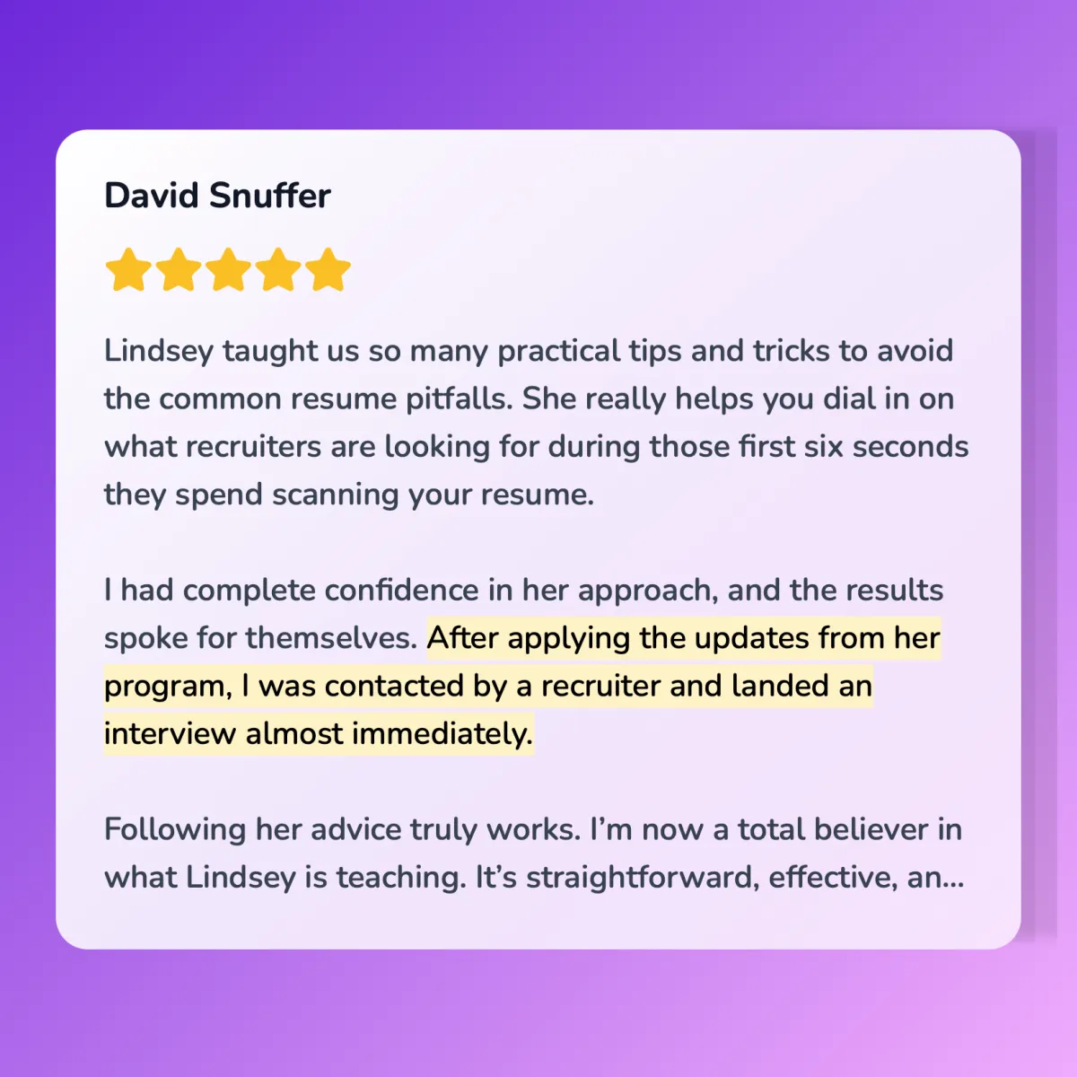 You'll get instant access to begin implementing the framework, and start seeing results within 30 days. If you’ve done the work - updated your resume using our template and framework - and you’re not seeing measurable traction and land an interview, simply contact me for a full refund. I want you to be wildly successful and share this program with all of your friends!